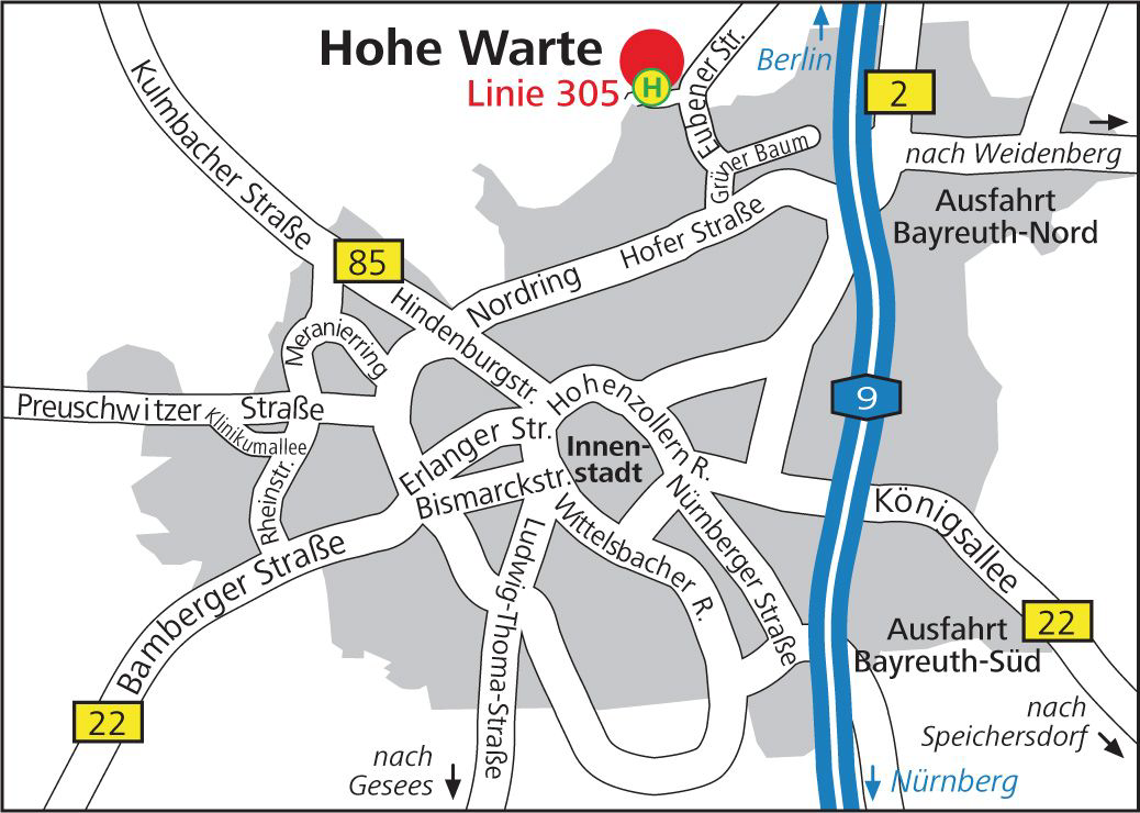 Die Klinik Hohe Warte kann bequem mit dem Stadtbus erreicht werden. Die Haltestelle befindet sich unmittelbar vor dem Haupteingang.
